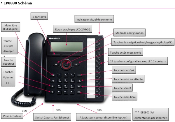 LG-Nortel 8830 IP Phone Téléphone SIP et MGCP compatible avec tous les IPBX Avec le téléphone IP8830, vous bénéficiez d'une haute qualité sonore à large bande. Très facile à utiliser, il est équipé d'un écran à cristaux liquides (LCD) rétro-éclairé de 4 lignes. Vous visualisez d'un coup d'oeil qui vous appelle. Grâce aux 24 touches de mémoires directes programmables, vous enregistrez les numéros que vous utilisez le plus fréquemment. Le LG-Nortel 8830 intègre un haut-parleur en son Full Duplex pour vous permettre de partager la conversation avec vos collègues ou de communiquer les mains libres pour taper à l'ordinateur, faxer un document, prendre des notes... Compatible SIP et MGCP, l'IP Phone 8830 se branche sur votre système de téléphonie IP, sur votre IPBX interne ou via un IPCentrex externe. Auto-alimenté par le PoE (Power over Ethernet), vous n'avez pas besoin de le brancher sur une prise secteur (alimentation secteur vendue en option - réf. LGAL). Compatible modules d'extension : Ajoutez des touches de fonctions programmables sur votre téléphone IP8830 ! Avec un module d'extension, vous passez de 24 touches à 36 touches de fonctions programmables !