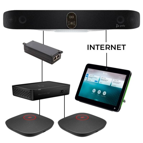 Ce boîtier PoE est incontournable dans vos salles de réunion : il sert à faire la liaison entre votre barre vidéo Poly et le pont audio Poly Studio A2.