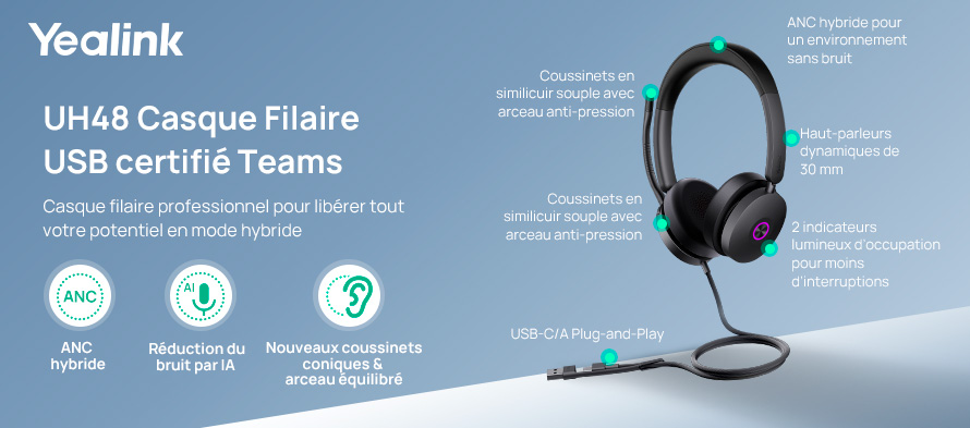 Le casque Yealink UH48 est conçu pour tous les professionnels cherchant à maximiser leur productivité lors de leurs communications au bureau ! Doté de technologies avancées, telles que la réduction de bruit active et la double connexion USB-A/C, vous profitez d'une expérience audio sans précédent, aussi bien pour les appels professionnels que pour l'écoute de musique.